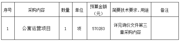 根據(jù)《衢州市國(guó)有企業(yè)采購(gòu)管理辦法(試行)》規(guī)定,衢州市智信工程咨詢(xún)有限公司受衢州市瑞城科技產(chǎn)業(yè)服務(wù)有限公司的委托,就衢州高鐵新城智慧產(chǎn)業(yè)園(五期—1)A區(qū)北側(cè)(1-5層)公寓運(yùn)營(yíng)項(xiàng)目采購(gòu)進(jìn)行詢(xún)價(jià),本項(xiàng)目為非依法必招項(xiàng)目,現(xiàn)請(qǐng)合格供應(yīng)商參加投標(biāo)。
